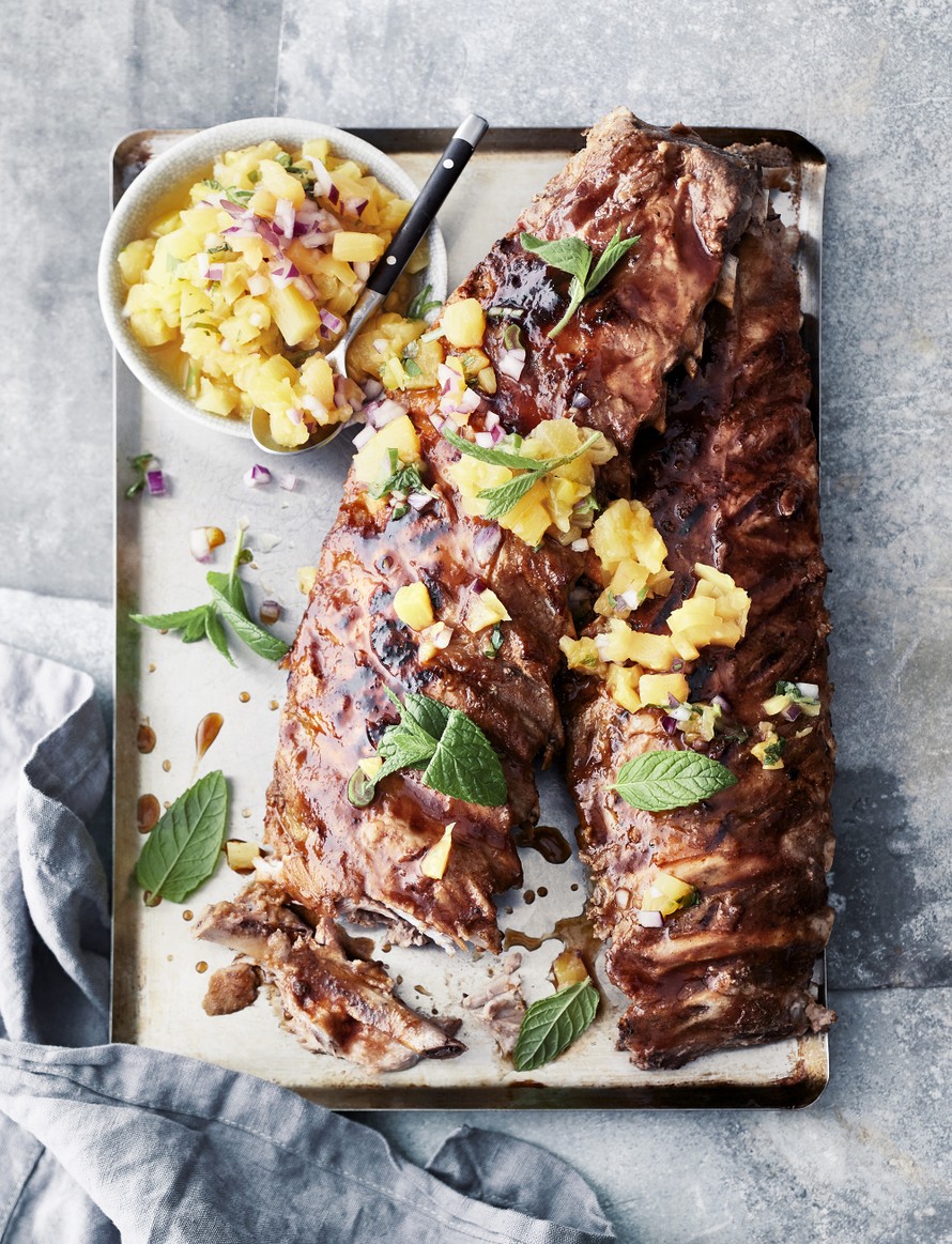 - Sivele kastiketta keitetyille lihoille. Paista grillissä, kunnes liha on rapeaa. Tarjoa lopun kastikkeen, hienonnetun kevätsipulin ja ananassalsan kanssa.