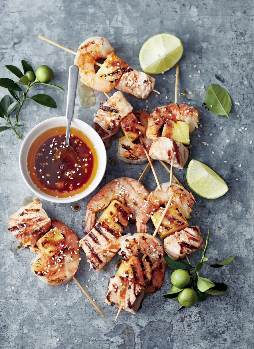 - Leikkaa lohi kuutioiksi. Poista ravuista kuoret. Leikkaa ananas kuutioiksi. Tikuta kaikki vartaisiin. Pirskota päälle limemehua ja anna maustua n. 5 min.