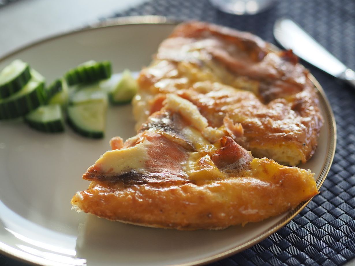 4. Asettele lohiviipaleet päällimmäiseksi. Kypsennä 225-asteisessa uunissa noin 25 minuuttia, kunnes munakas on täysin hyytynyt.
