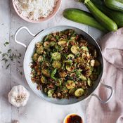 4. Keitä miedolla lämmöllä kannen alla 15 min. Mausta yrteillä ja valkosipulilla.
