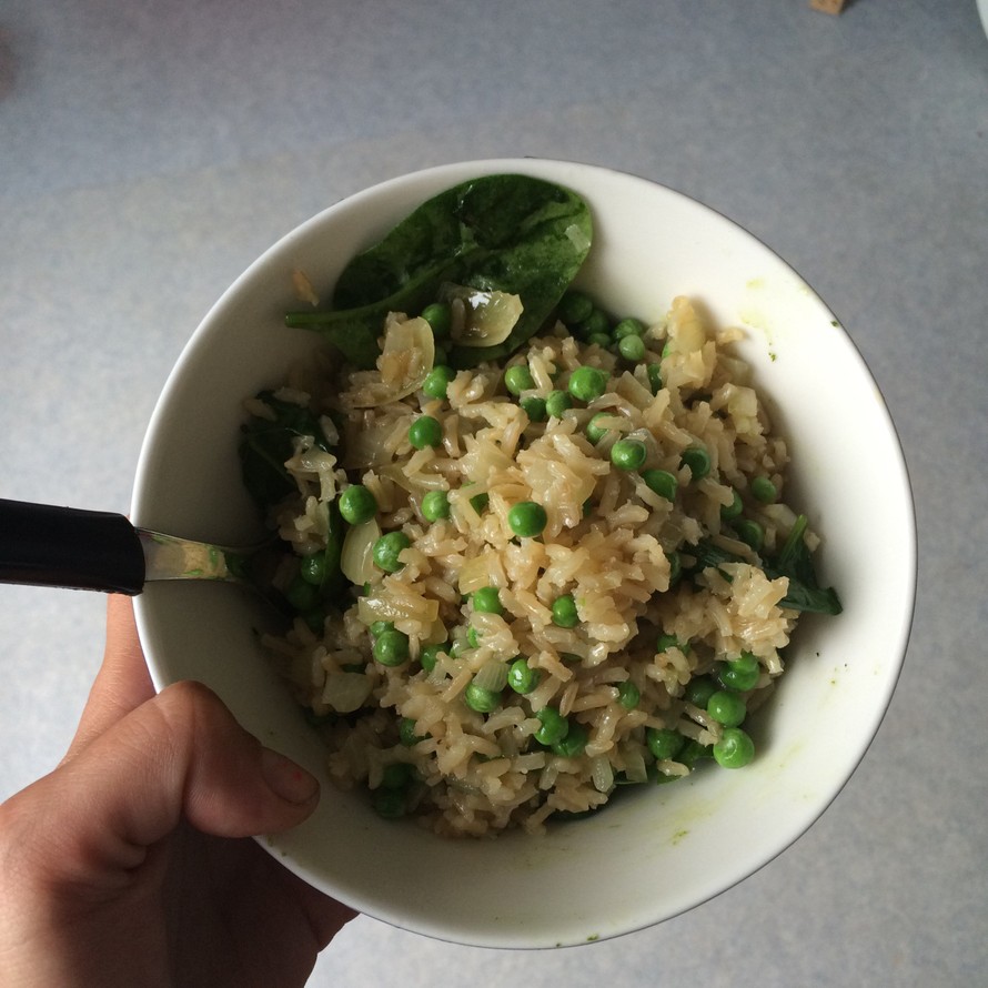 - Kun riisi on valmista, lisää pannulle herneet ja pinaatti. Niiden tarvitsee lämmetä vain hetki.