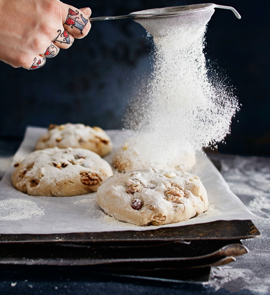 - Leivo taikina 4–6 leiväksi leivinpaperilla vuoratulle pellille ja anna kohota peitettyinä 45 minuuttia. Laita uuni kuumenemaan 250 asteeseen.