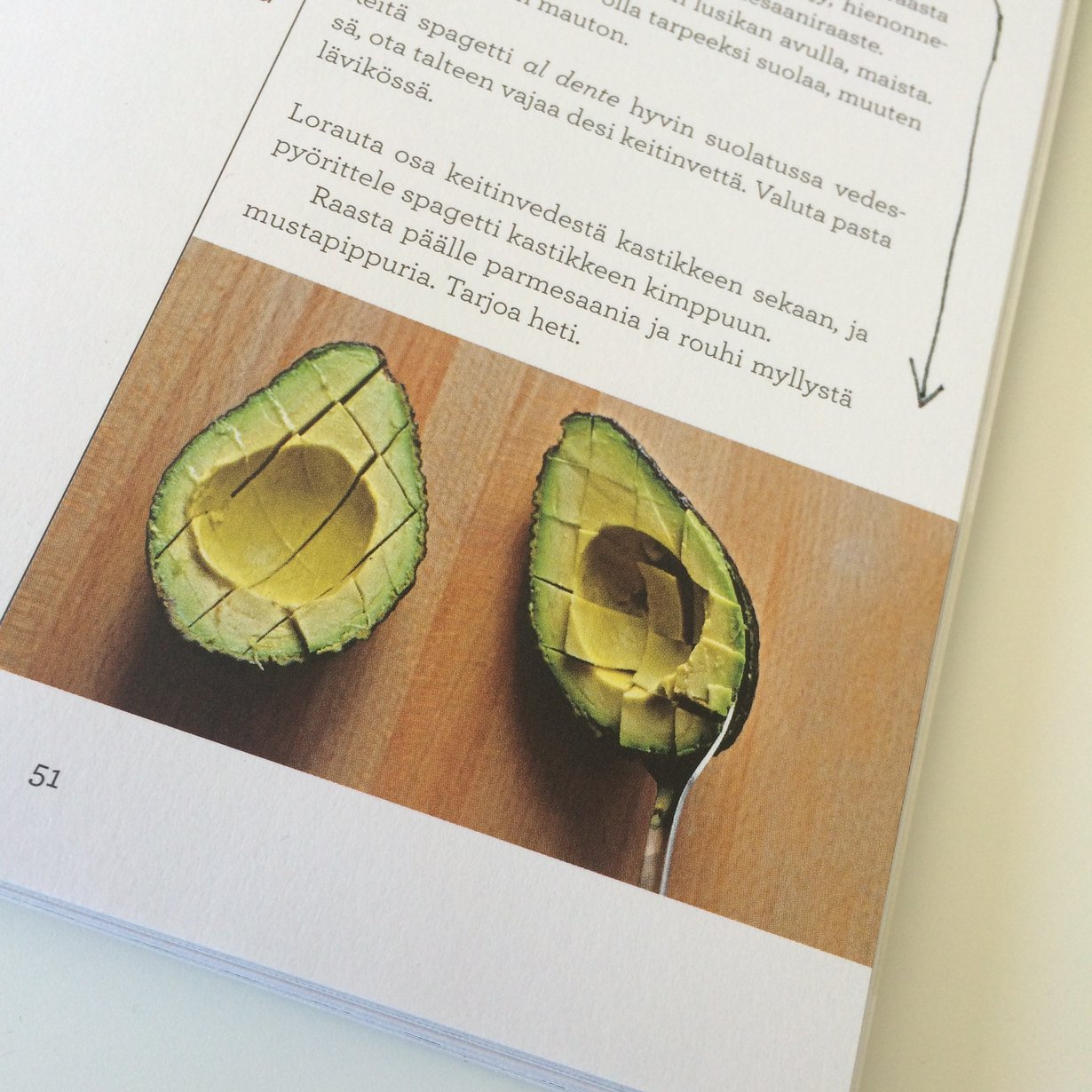 "Voit tehdä kastikkeen suoraan tarjoilukulhoon , jossa kannat pastan pöytään. Pilko valkosipuli ja chili, laita ne kulhoon. Purista limetin mehu mukaan. Halkaise avocadot ja poista niistä kivet. Kuutioi avocado kuoressaan ja kaiverra sisus ruokalusikan avulla kulhoon. Hienonna yrtit ja raasta juustot. Lisää suola, pippuri, oliiviöljy, hienonnetut yrtit, sekä pecorino- ja parmesaaniraaste.""Pistä homma sekaisin lusikan avulla, maista. Kastikkeessä tulee olla tarpeeksi suolaa, muuten lopputulos on mauton."