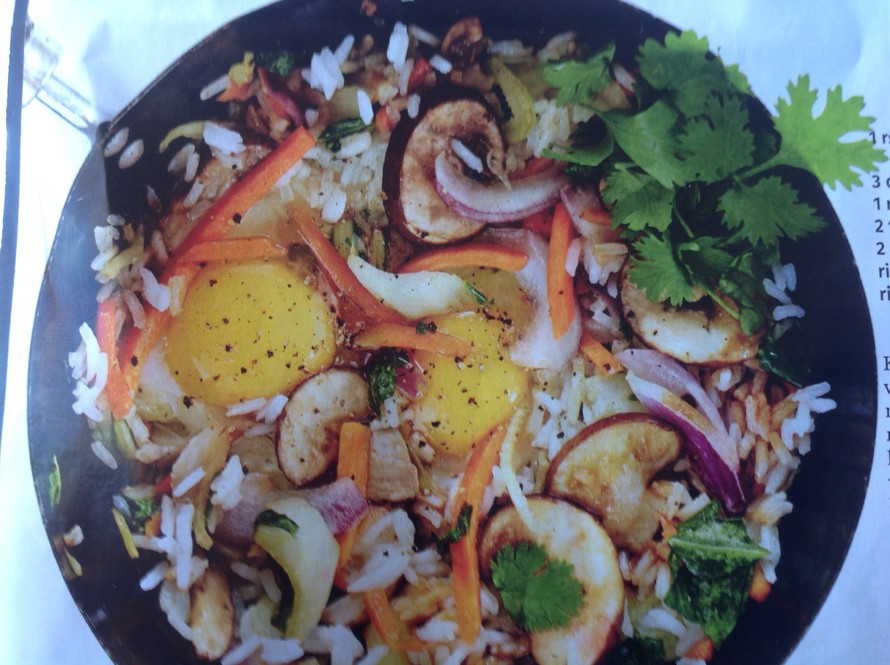 Kuumenna öljy wokissa. Paista kasviksia sekoitellen pari minuuttia, lisää riisit ja jatka kuumentamista pari minuuttia. Mausta soijakastikkeella, suolalla ja pippurilla. Tee munia varten kolot ja riko munat koloihin. Vähennä lämpöä ja anna munien hyytyä jonkin aikaa. Voit myös sekoittaa munat ruoan joukkoon. Silppua pinnalle korianteria.
