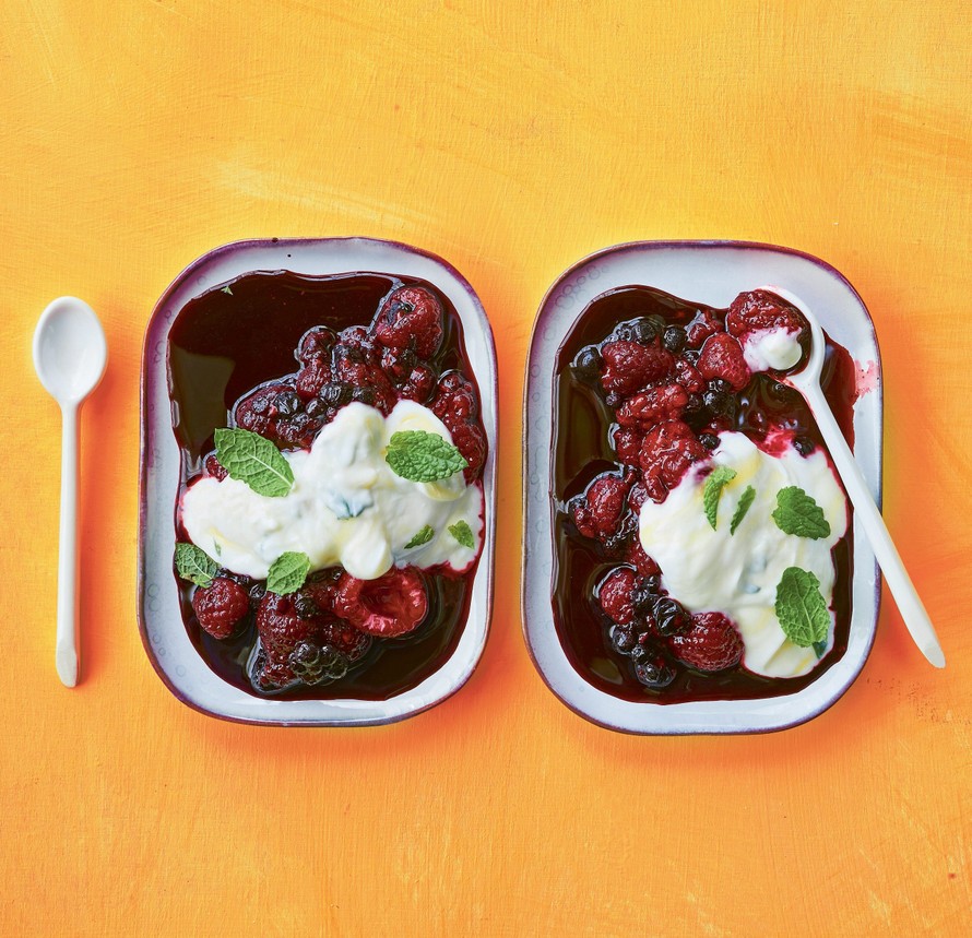 - Sekoita kulhossa jogurtti, sitruunatahna ja minttu. Jaa marjat mehuineen annoskulhoihin ja lusikoi minttu-sitruunajogurttia marjojen päälle.