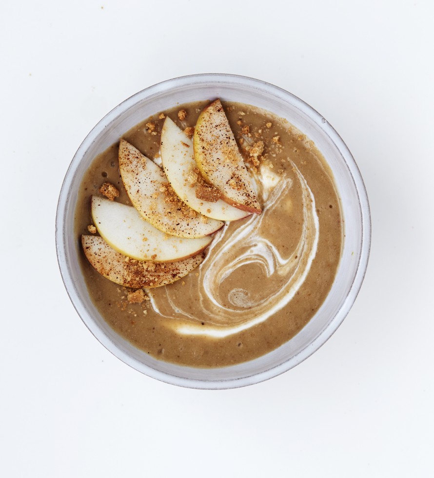 Terveellinen aamupala lainaa makumaailmansa omenapiirakalta. Paksu, jäisestä banaanista surautettu, smoothie muistuttaa ihanasti jäätelöä. Koristele kulho tuoreilla, kanelilla maustetuilla, omenoilla ja granolalla.