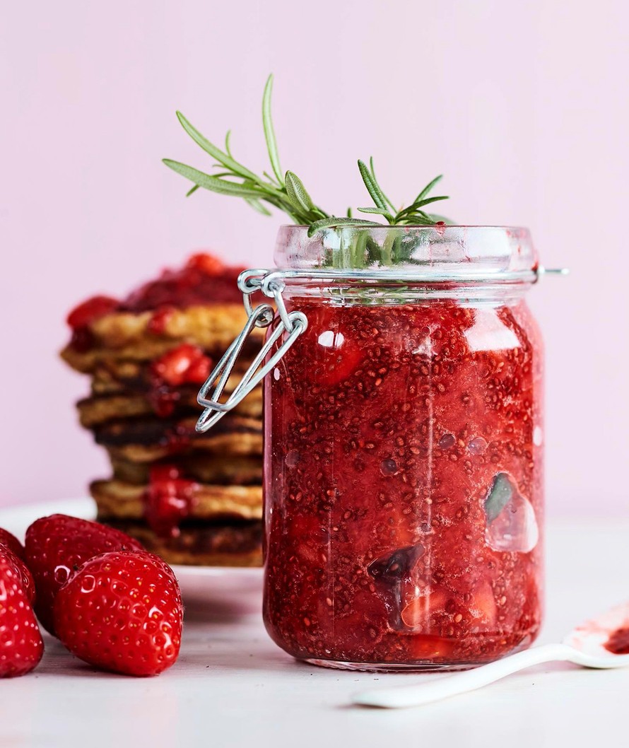 Rosmariini antaa jännän metsäistä makua mansikkahillolle. Hillo sakeutuu perinteisen hillosokerin sijaan chiasiemenillä. Tarjoile hillo kaurapannarien kanssa.