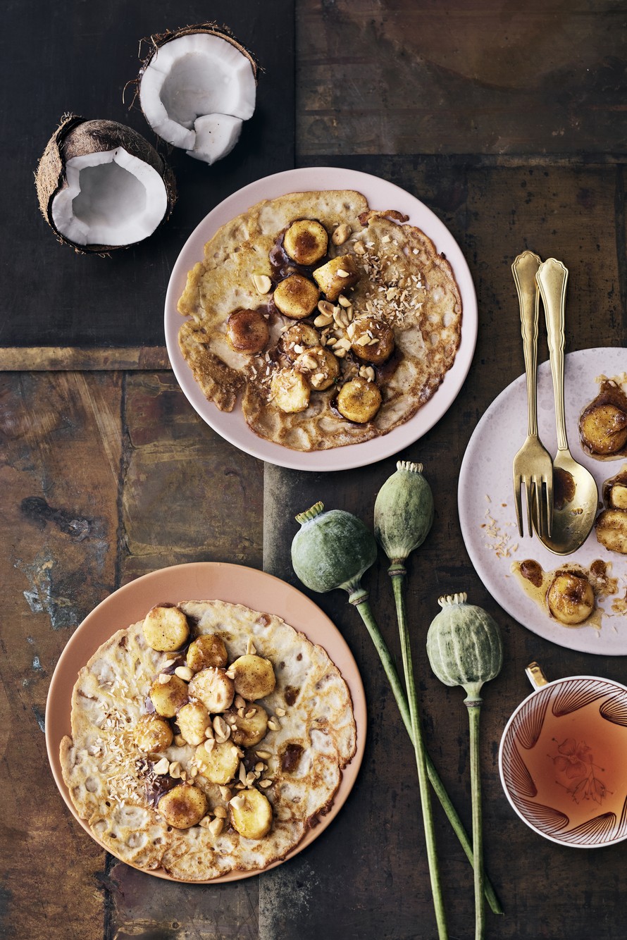 Thaimaalaiset kookosletut sopivat niin brunssille kuin jälkiruoaksi. Lastaa päälle karamellisoitua banaania ja suolapähkinöitä, ja nauti!
