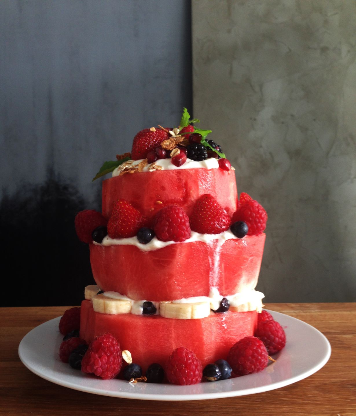 3. Aloita kokoaminen: laita ensimmäinen melonilevy tarjoilulautaselle. Levitä pintaan jugurttia, mysliä ja banaanisiivuja. Nosta toinen levy päälle ja toista. Laita ylimmän kerroksen päälle vielä kasaan jugurttia, marjoja ja mysliä. Koristele kakun muutkin reunat.