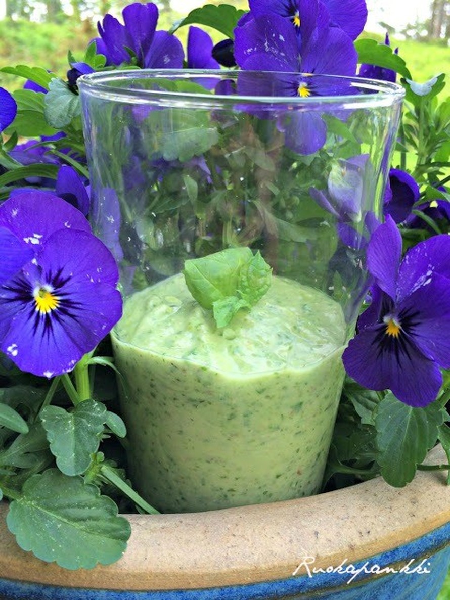 Kaikki tehosekoittimeen tai sauvasekoittimella jauhaen tasaiseksi massaksi. Nauti heti ja raikastu ;)