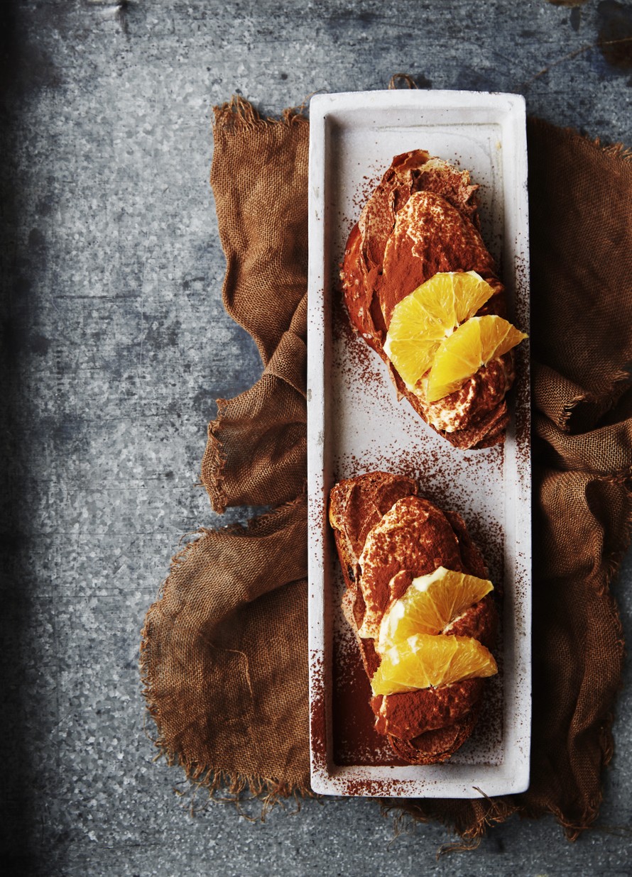 3. Lusikoi kaakaojauhe siivilään ja tomuta rahkan päälle. Koristele appelsiinirenkaiden puolikkailla.