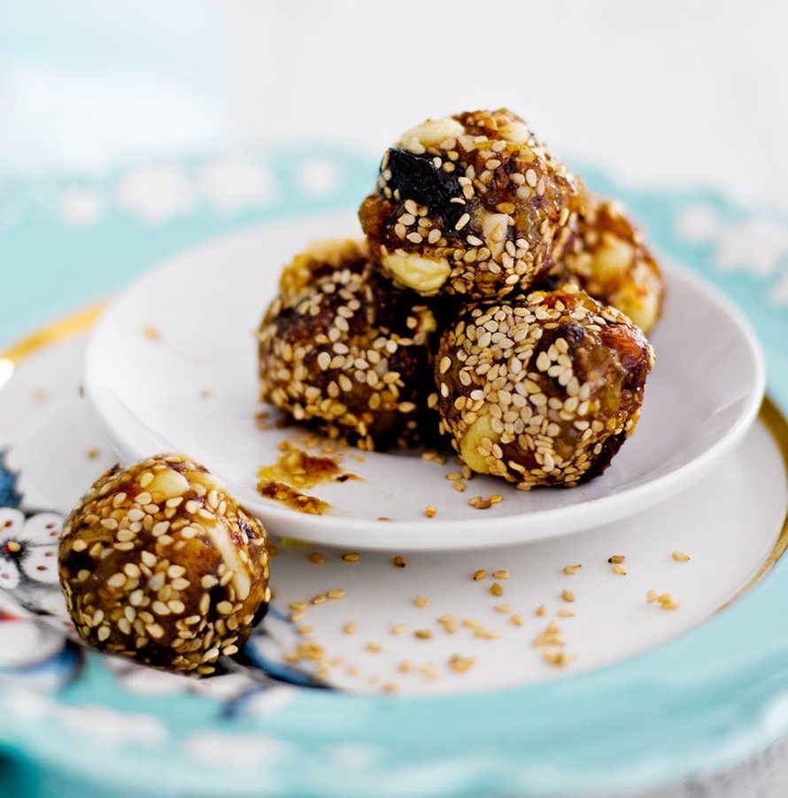 Pähkinöistä ja kuivatuista hedelmistä pyöräytetyt pallot tyydyttävät makeanhimon terveellisesti.