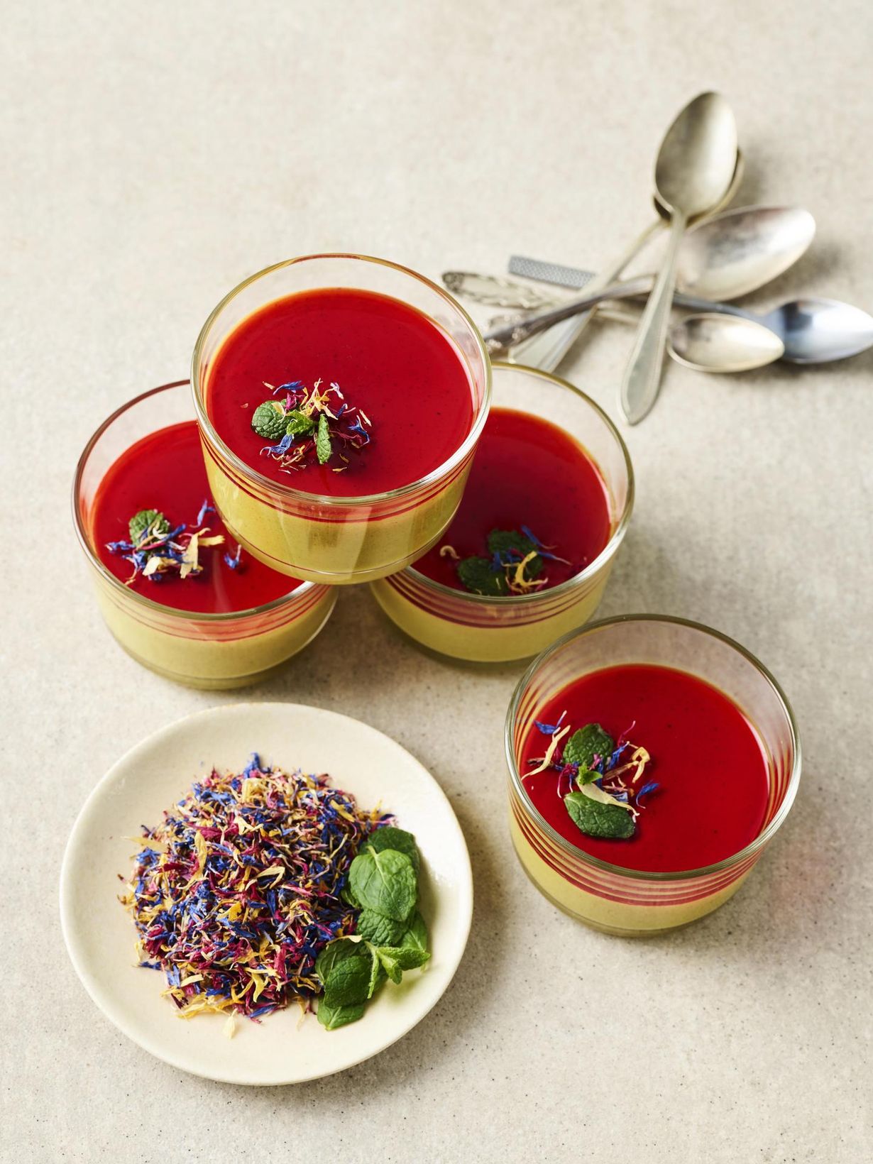 - Siivilöi siirappi ja valuta se pannacottien päälle. Koristele kuivatuilla kukilla ja tarjoa heti.