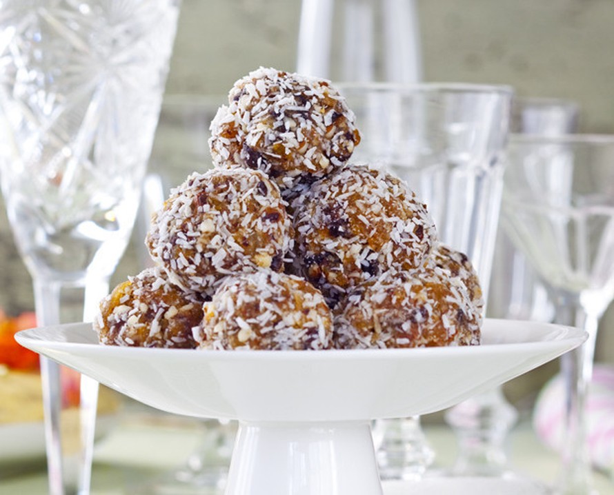 - Sekoita tahini joukkoon. Pyöritä palloiksi ja kieritä kookoshiutaleissa.