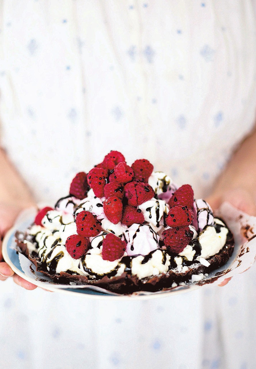 - Nosta pähkinäsuklaapohja tarjoiluvadille. Levitä päälle vaniljakastiketta. Murustele pinnalle marenkeja. Lisää vadelmat. Valuta lopuksi päälle lakritsikastiketta. Tarjoile heti.