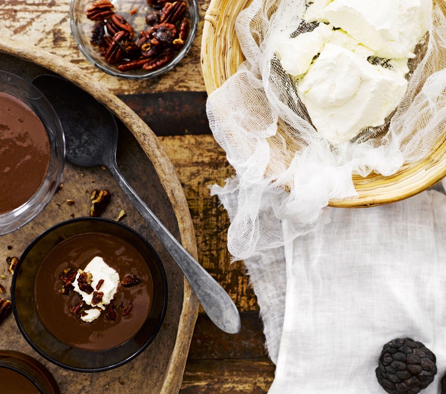 Keitä kaakaosta ja suklaasta lämmin keitto ja paahda pekaanit sokerissa rapeiksi.