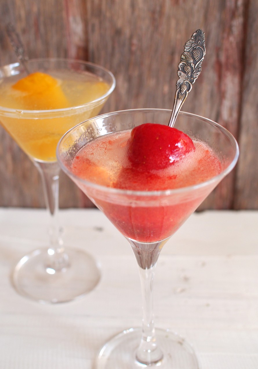 Jaa soseet snapsilaseihin. Nosta lasien päälle lusikat ja jäädytä 2-4 tuntia. Irrota jäätyneet soseet kipoista ja nosta pienet hedelmäjädet cocktaillaseihin tai pieniin viinilaseihin. Kaada päälle kuohuvaa ja nauti.