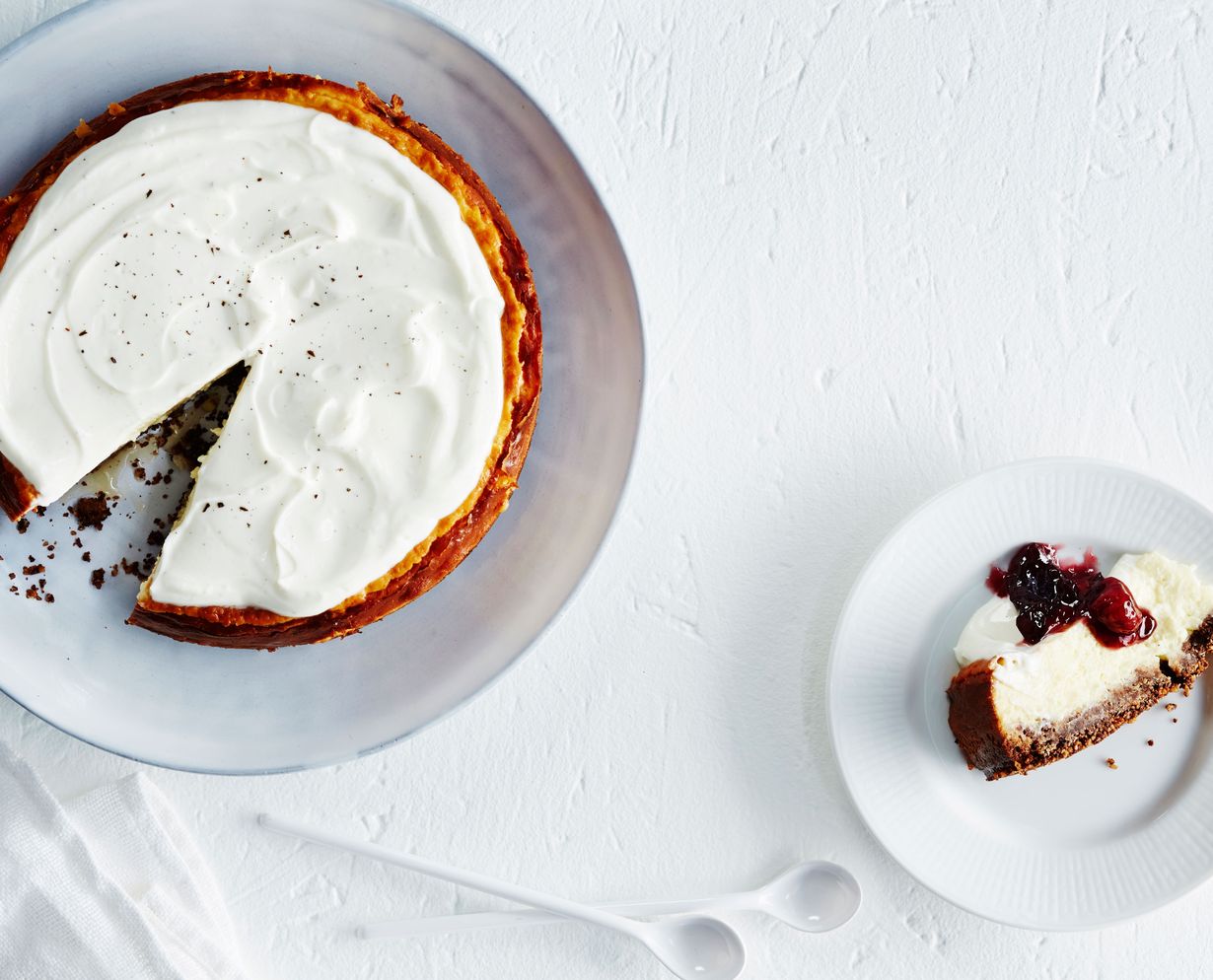 - Sekoita kuorrutetta varten rahka ja sokerit tasaiseksi seokseksi. Levitä kuorrute kakun pinnalle. Tarjoa kakku esimerkiksi kirsikkahillon kanssa.