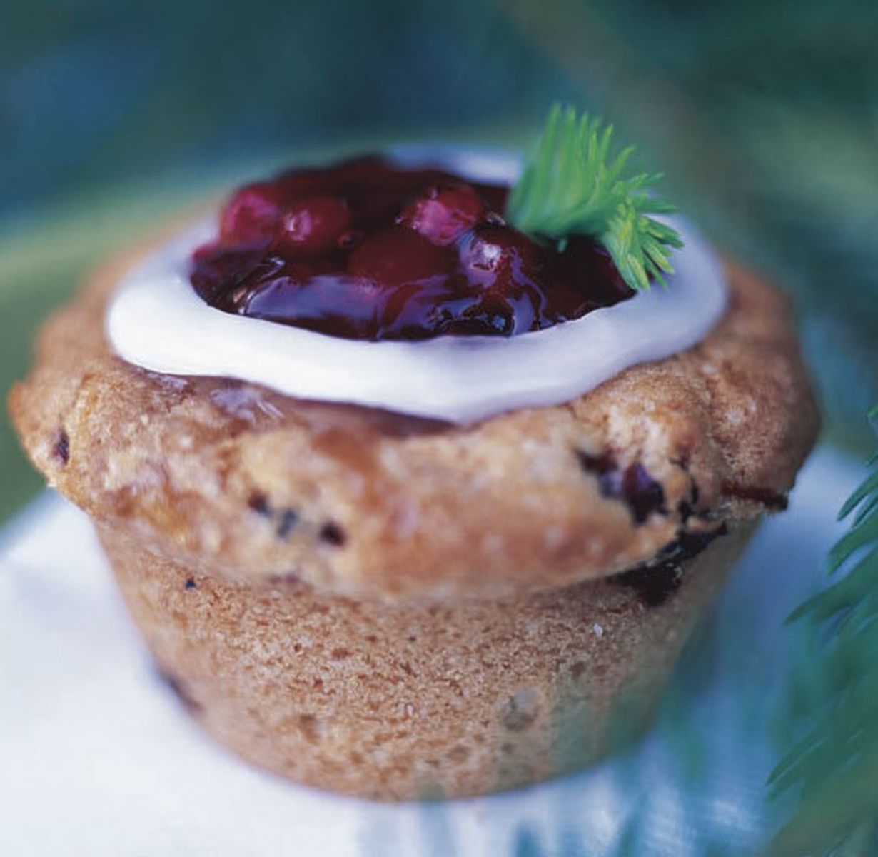 - Sekoita tomusokeri ja vesi. Laita seos pursotinpussiin ja tee rengas puolukkakoristeen ympärille. Koristele muffinit kuusenkerkillä (uusi, vaaleanvihreä kasvutupsu kuusenoksan päässä) tai puolukanvarvuilla.