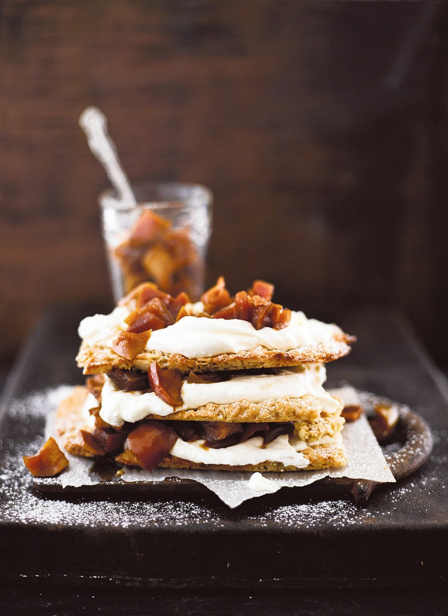 - Nosta keksipohja tarjoiluvadille. Lusikoi päälle kolmasosa mascarponevaahdosta. Nostele päälle kolmasosa omenahillokkeesta. Nosta hillokkeen päälle keksipohja ja täytä mascarponevaahdolla ja hillokkeella. Tee näin vielä yksi kerros. Nauti heti.