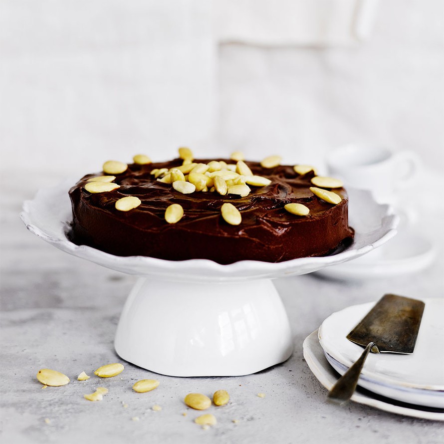 - Yhdistä paloiteltu suklaa ja kahvi tai rommi ja sulata vesihauteessa tai mikroaaltouunissa. Lisää pehmeä voi pienissä erissä vispaten. Anna kuorrutuksen jäähtyä hieman, noin 20 minuuttia, aina välillä sekoittaen. Levitä kakun pintaan ja reunoille ja koristele lopuksi manteleilla.