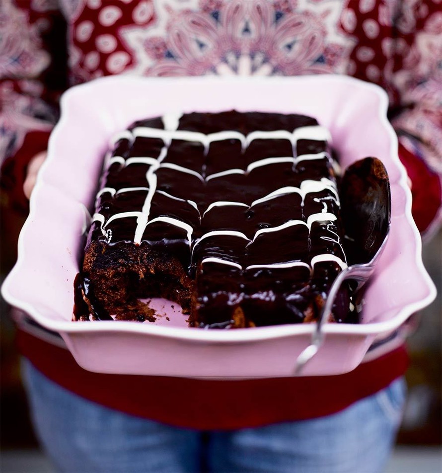 - Kuorrutusta varten kiehauta kerma. Sulata taloussuklaa kermaan. Sekoita tasaiseksi ja anna jäähtyä hetki. Levitä jäähtynyt, mutta vielä valuva suklaakuorrutus kakun päälle. Kaada suklaa kakun keskelle ja levitä se siitä reunoille.