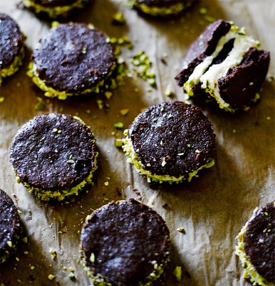 - Pursota tai lusikoi täyte jäähtyneiden keksien väliin. Paina toinen keksi kanneksi ja pyöräytä keksin välistä pilkistävä reuna pistaasirouheessa.
