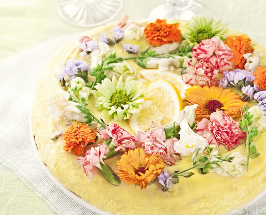 - Voitele irtopohjainen kakkuvuoka ja ripottele pinnalle esimerkiksi kookoshiutaleita. Kaada taikina vuokaan ja paista uunin alatasolla noin 30 minuuttia. Jäähdytä kakku kunnolla ennen kuorruttamista. Sekoita kaikki päällyksen ainekset keskenään ja levitä kakun päälle. Koristele hedelmillä ja syötävillä kukilla.