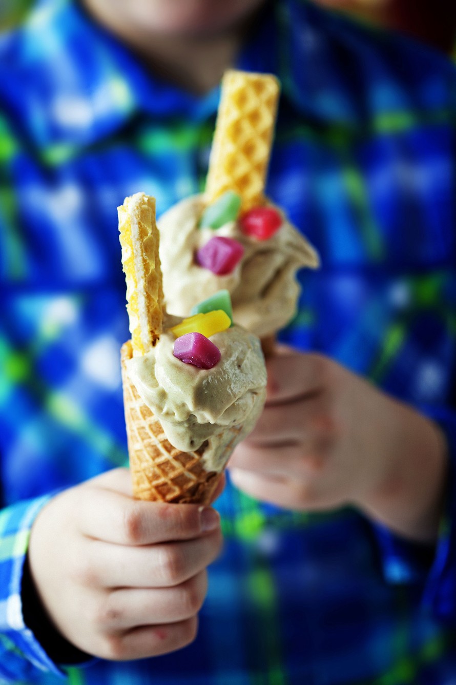 - Sekoita massasta tasainen jäätelö ja lusikoi se suoraan vohveliin tai jälkiruokakulhoon. Koristele halutessasi karkeilla ja kekseillä.