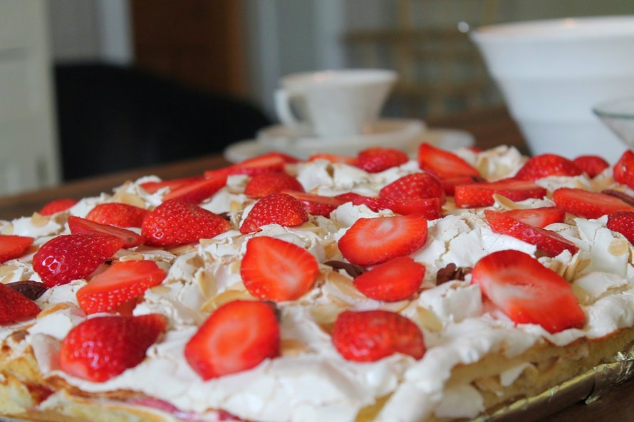 Aloita kakun valmistaminen vaahdottamalla voi ja sokeri. Lisää keltuaiset vatkaten. Sekoita joukkoon kuivat aineet seoksena vuorotellen maidon kera. Levitä kakkutaikina suorakaiteeksi (25 x 30 cm) leivinpaperilla vuoratulle uunipellille. Esikypsennä pohjaa uunin keskiosassa 180 asteessa 10 min. Vatkaa valkuaiset kovaksi vaahdoksi. Lisää sokeri pieninä erinä. Vatkaa kunnes valkuaisvaahto pysyy kulhossa, vaikka kulho käännetään ylösalaisin. Levitä marenki lusikalla pohjalle. Ripota pinnalle mantelilastut ja pekaanipähkinöitä . Paista vielä uunin keskiosassa 180 asteessa 15 min eli kunnes pinta on kauniin ruskea. Anna jäähtyä.