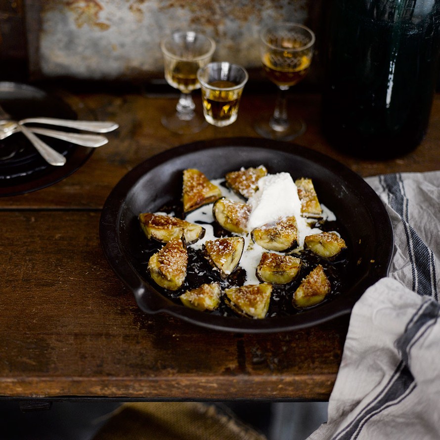 Karamellisoidut banaanit ja kookosraakajäätelö