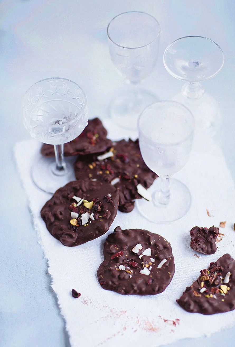 - Rouhi kirsikat ja pistaasipähkinät hienoksi rouheeksi. Sekoita joukkoon kaakaonibsit. Ota ruokalusikallinen seosta talteen koristelua varten. Sekoita loput pähkinä-kirsikkaseoksesta suklaasulan joukkoon.