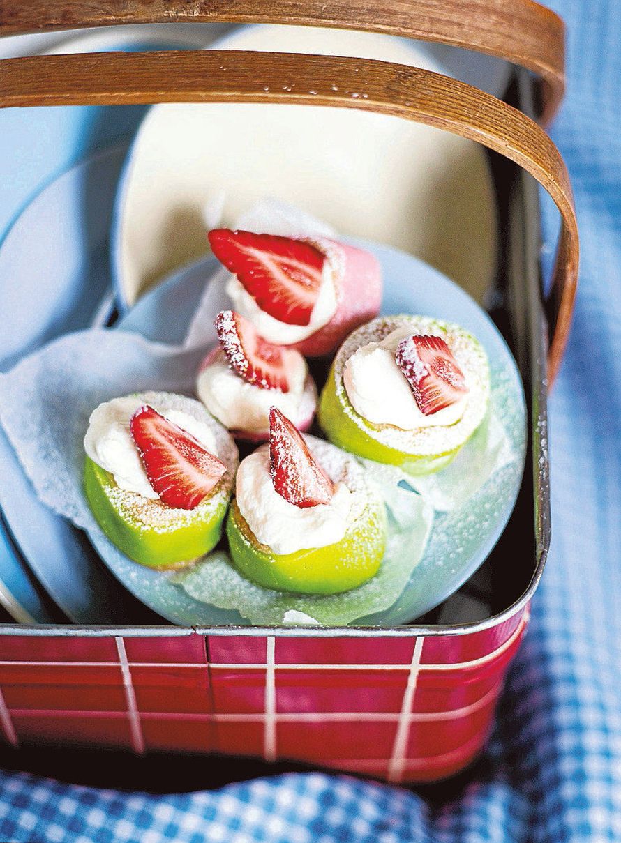 - Vatkaa vispikerma vaahdoksi. Leikkaa mansikat lohkoiksi. Viipaloi marsipaanirulla noin parin sentin paksuisiksi viipaleiksi. Nosta päälle nokare kermavaahtoa. Koristele mansikoilla ja tomusokerilla.