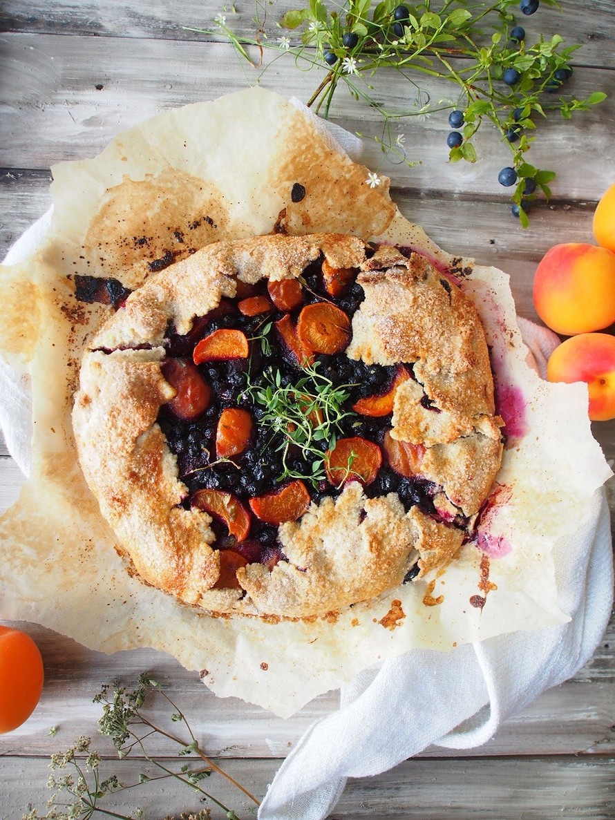 Mustikka-aprikoosigalette sopii täydellisesti mökkioloihin. Rustiikkisessa pohjassa ruisjauhoja ja täytteessä hedelmäisyyttä korostaa tuore timjami.
