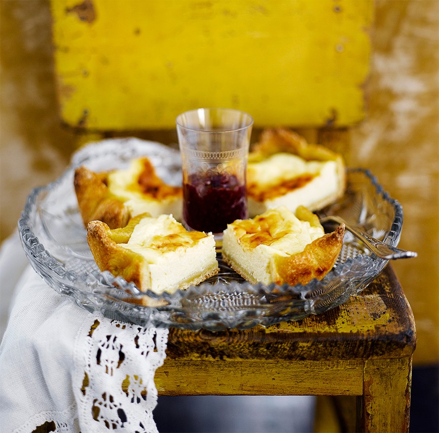 Venäläisessä rahkapiirakassa on ohut taikinakuori ja runsas täyte.