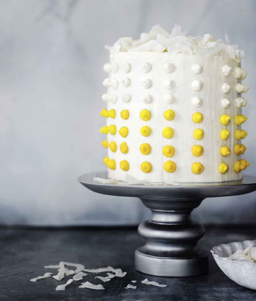 - Jaa koristelua varten vaahto kolmeen osaan. Lisää kahteen osaan muutama tippa keltaista pastaväriä. Sekoita väri tasaisesti kermaan. Pursota koristepallot kakun reunaan ja viimeistele pinta kookoslastuilla.