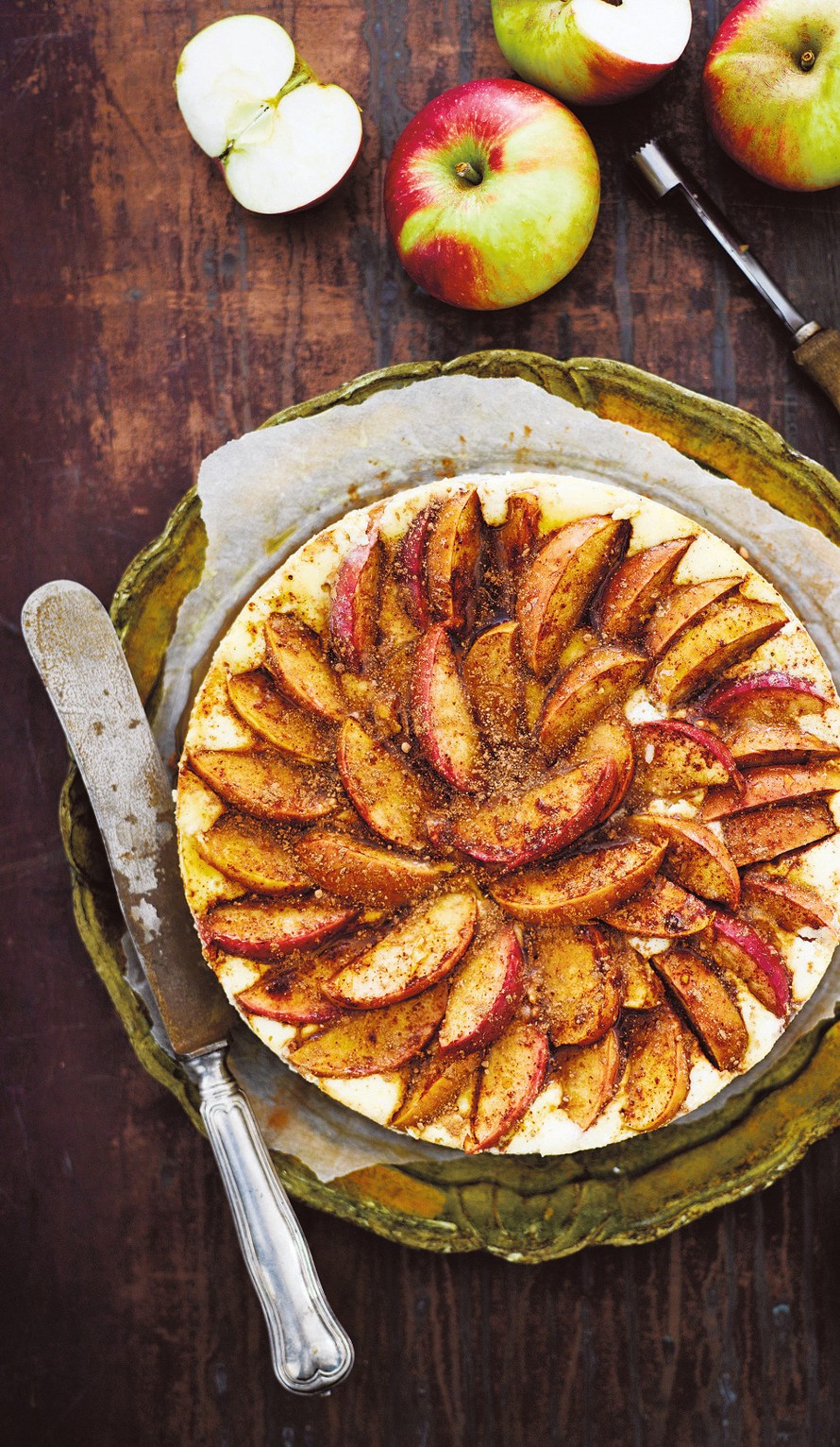 - Kaada seos keksipohjan päälle. Lado pinnalle omenaviipaleet ja valuta päälle liemi.