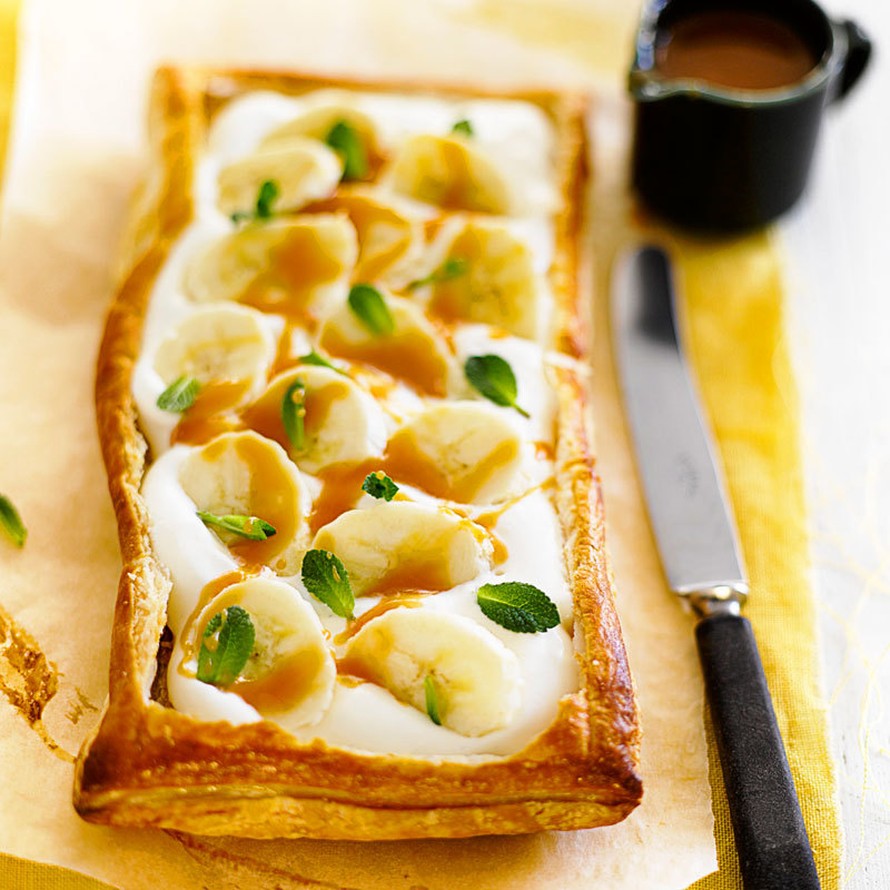Helppoa ja herkullista lohturuokaa lehtitaikinasta, kermavaahdosta ja banaaniviipaleista.
