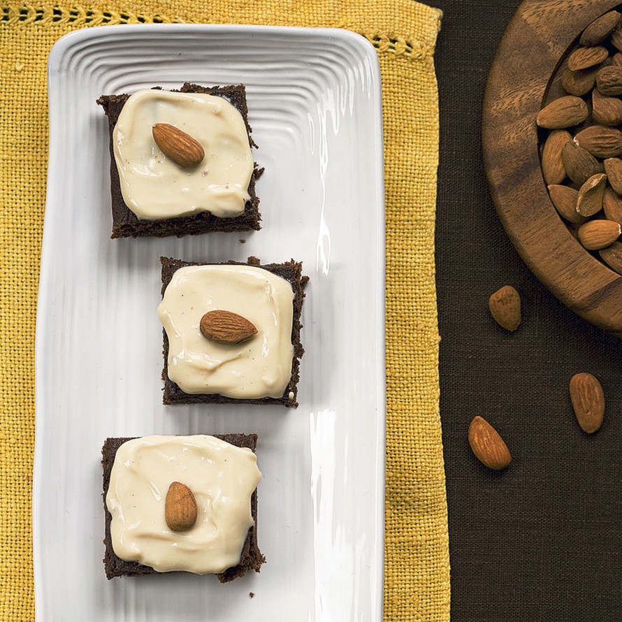 - Leikkaa piirakka pieniksi neliöiksi ja aseta jokaisen palan päälle manteli.
