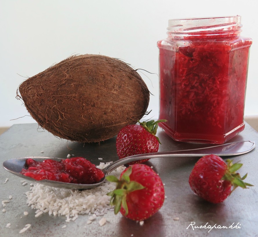Kookosmansikkahillo sopii erityisen hyvin kookosöljyssä paistettujen lettujen kanssa, ihanaa!