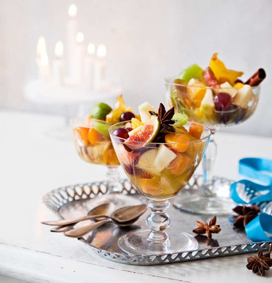 - Yhdistä kaikki paloitellut hedelmät ja kaada marinointiliemi päälle. Anna marinoitua kylmässä noin 2 tuntia. Laita tarjoiluastiaan. Jätä tähtianikset ja kanelitangot koristamaan hedelmäsalaattia.
