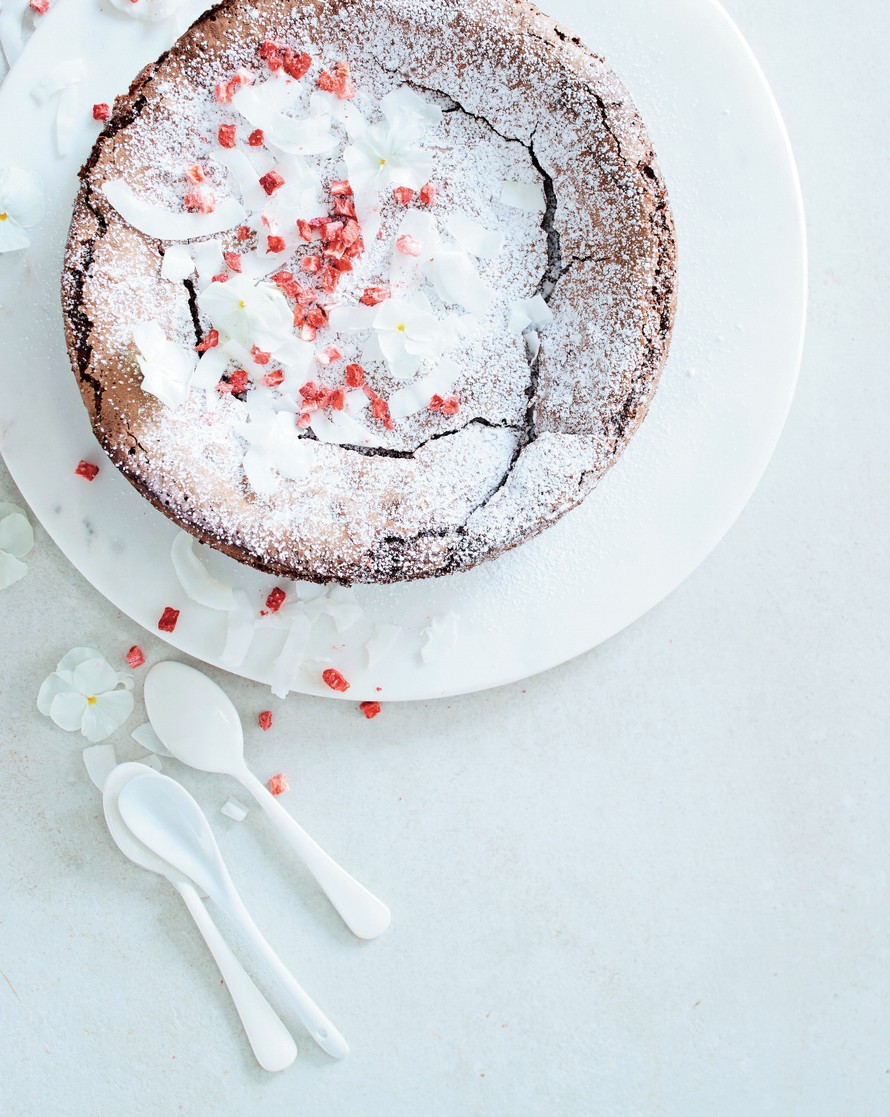 - Koristele jäähtynyt kakku tomusokerilla, kookoslastuilla, pakkaskuivatuilla mansikoilla ja tuoreilla orvokeilla.