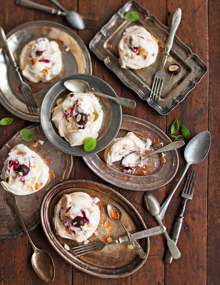- Annostele kirsikkakermavaahto marenkien keskellä olevaan syvennykseen. Ripota paahdettuja mantelilastuja leivosten pinnalle ja valele ne siirapilla. Koristele kirsikoilla.
