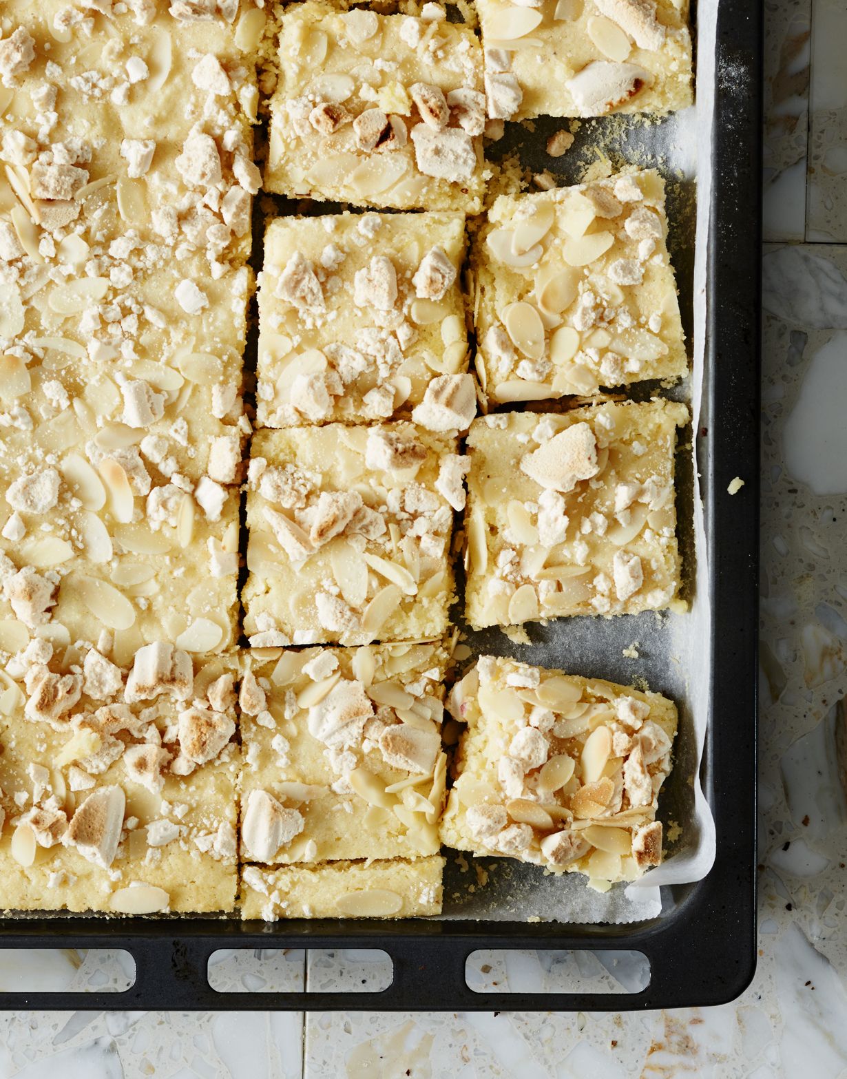 4. Kaada ja levitä taikina leivinpaperin päälle reunalliselle uunipellille. Ripottele päälle mantelilastut ja murenna marengit.