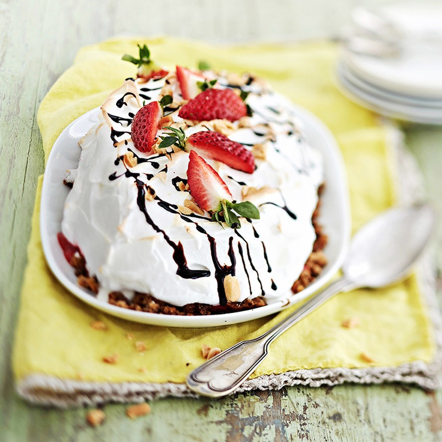 - Laita uunijäätelö kuumaan uuniin 2 minuutiksi tai kunnes pinta on saanut kauniin ruskean värin. Koristele rouhituilla suolapähkinöillä ja mansikanpuolikkailla. Tarjoa heti.