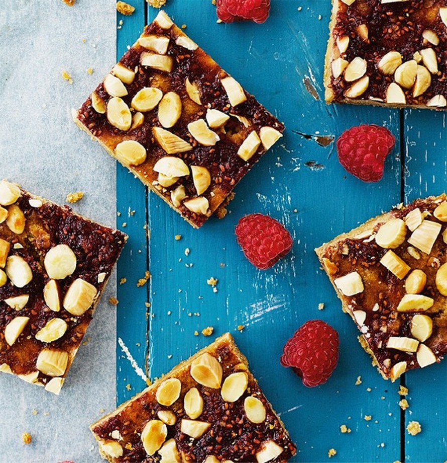 - Lusikoi taikina noin 25 cm x 30 cm:n kokoiseen leivinpaperilla vuorattuun vuokaan. Painele taikina jauhotetuin käsin tasaiseksi levyksi. Levitä hillo taikinan päälle. Rouhi mantelit ja ripottele ne levyn pinnalle. Paista 175-asteisessa uunissa noin 20 minuuttia. Anna levyn jäähtyä ennen leikkaamista.