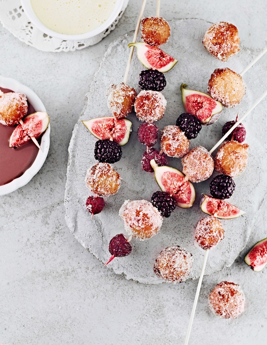 Donitsit ja kuorrutteen voi syödä myös erikseen. Minimunkit tikutetaan makeiden vadelmien ja viikunoiden kanssa vartaiksi ja dipataan sulaan suklaaseen ja vaniljakastikkeeseen.