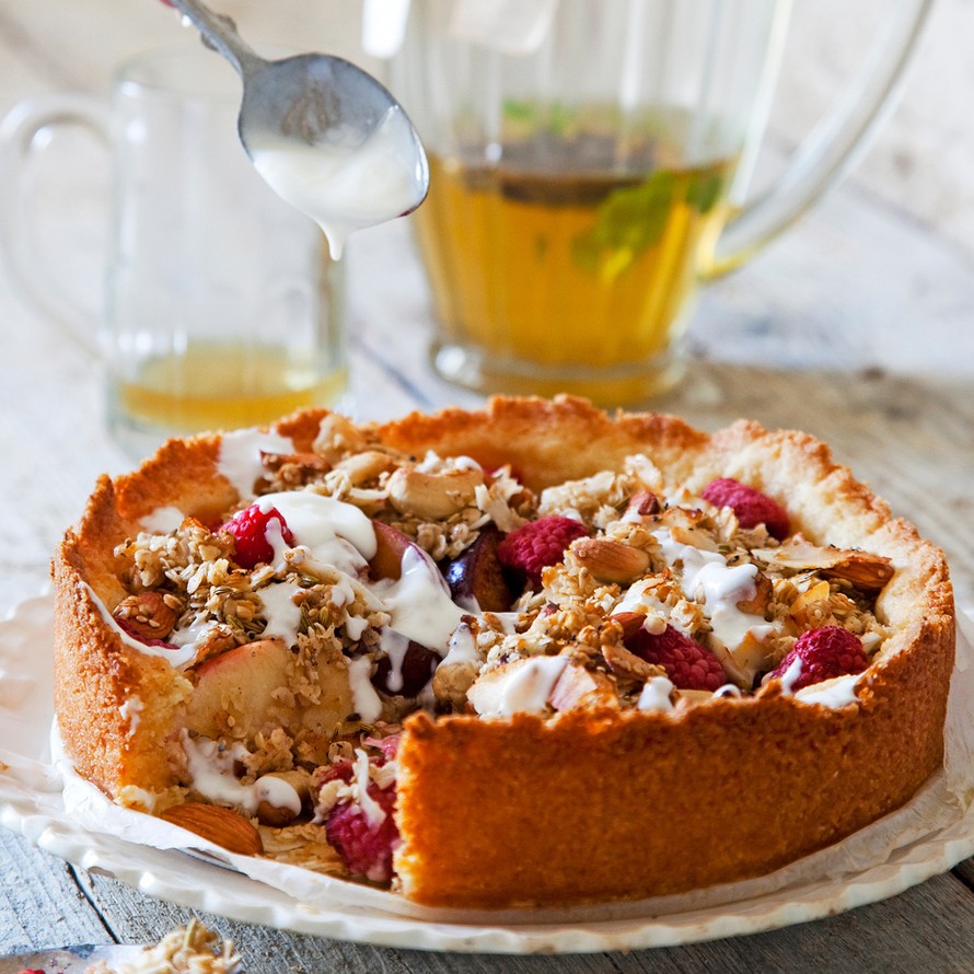 - Puhdista ja lohko hedelmät, täytä piirakkapohja hedelmillä ja vadelmilla. Lusikoi granolaseos päälle. Paista piirakkaa uunissa 20–30 minuuttia, kunnes omenat ovat pehmeitä ja pohja kypsä. Jos pinta uhkaa tummua, peitä piiras leivinpaperilla paistamisen loppuajaksi.