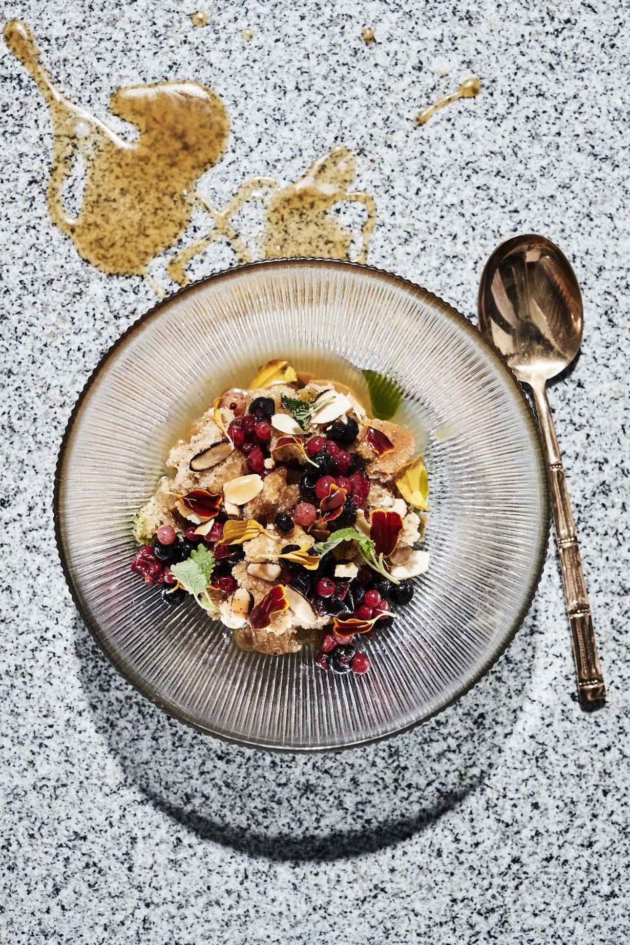 Financier on klassinen ranskalainen mantelileivos, jota näkee erilaisina versioina ravintoloiden jälkiruokalistoilla. Paahdettu manteli ja ruskistettu voi tuovat financieriin syvyyttä ja umamimaisen täyteläisiä vivahteita. Hapokkaat herukat ja suolalla maustettu makea kinuski täydentävät jälkiruuan.