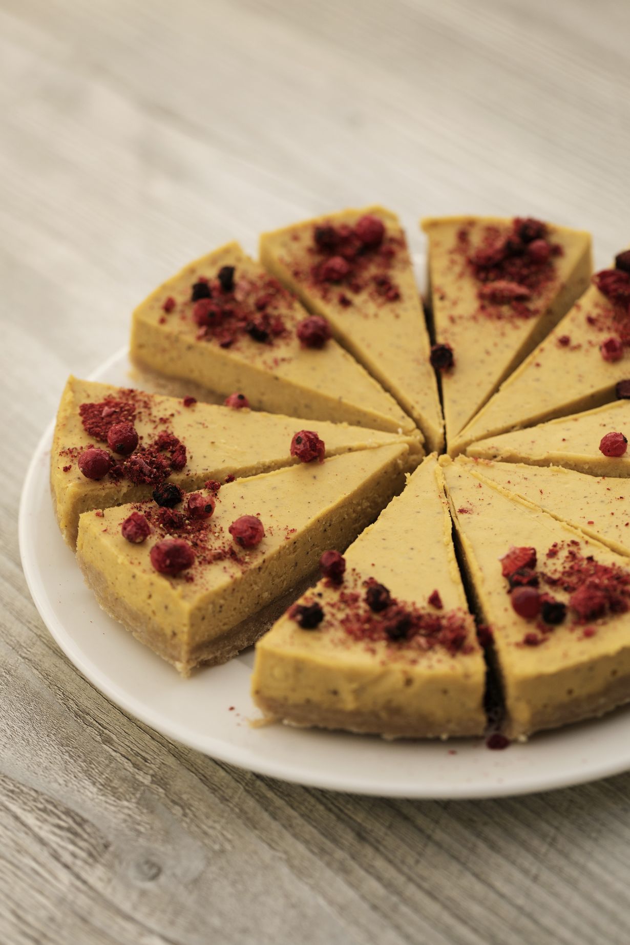 - Siirrä kakku 20-60 minuutiksi pakastimeen tiivistymään. Kakku on valmis, kun täyte on jähmettynyt ja kakun voi leikata kauniisti lohkeaviksi paloiksi. Koristele kakku pihlajanmarjajauheella.